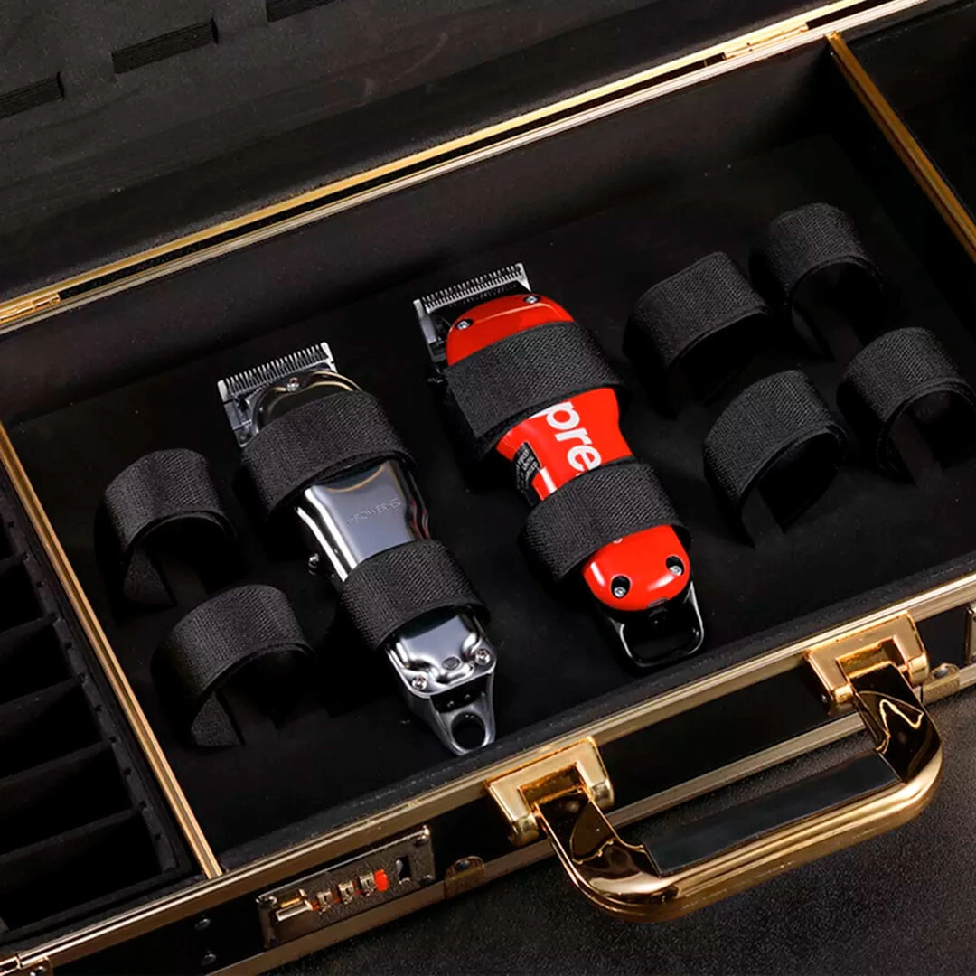 - En su interior posee un organizador para 10 alzas, 5 sujetadores para maquinas con ajuste regulable y 10 espacios para tijeras y/o peines