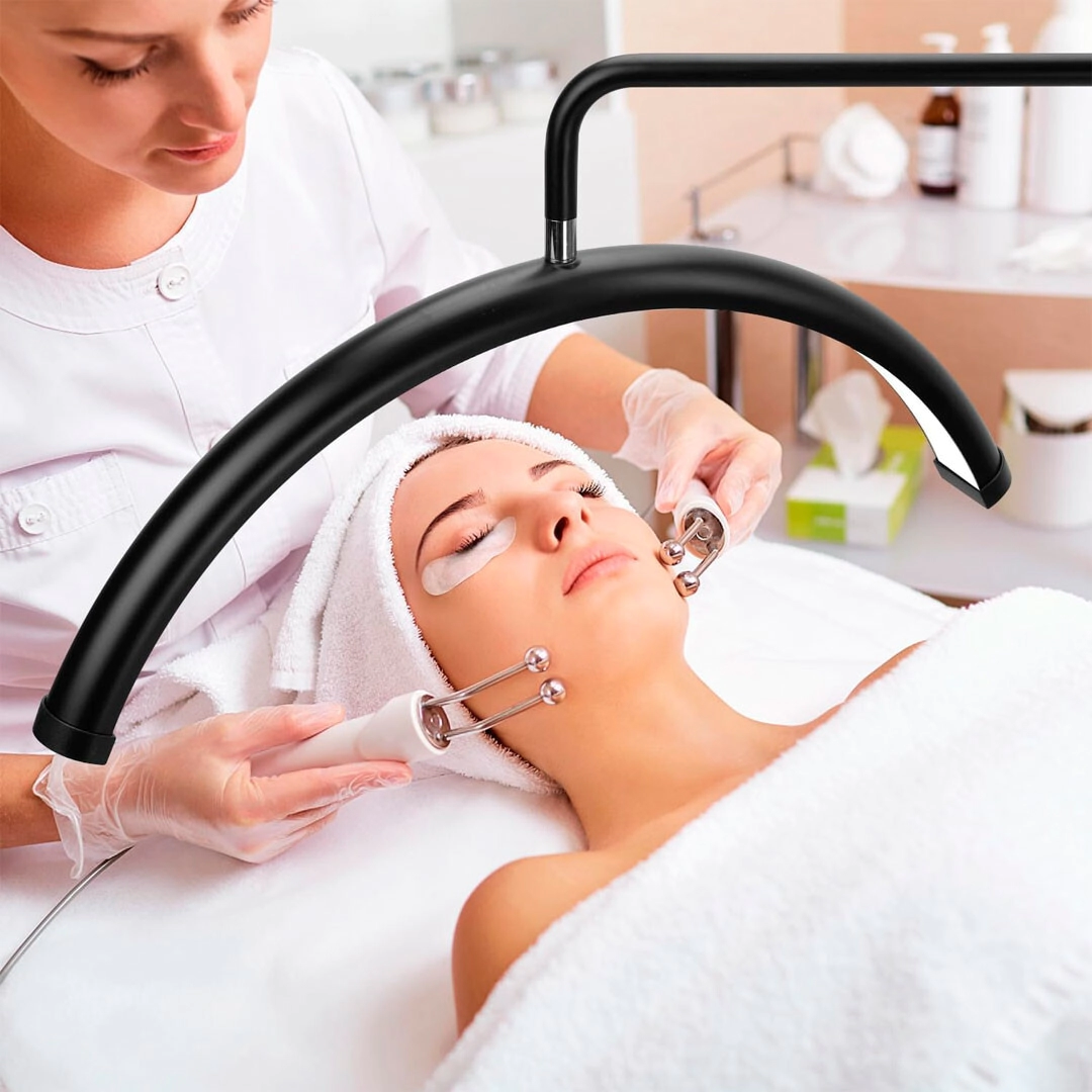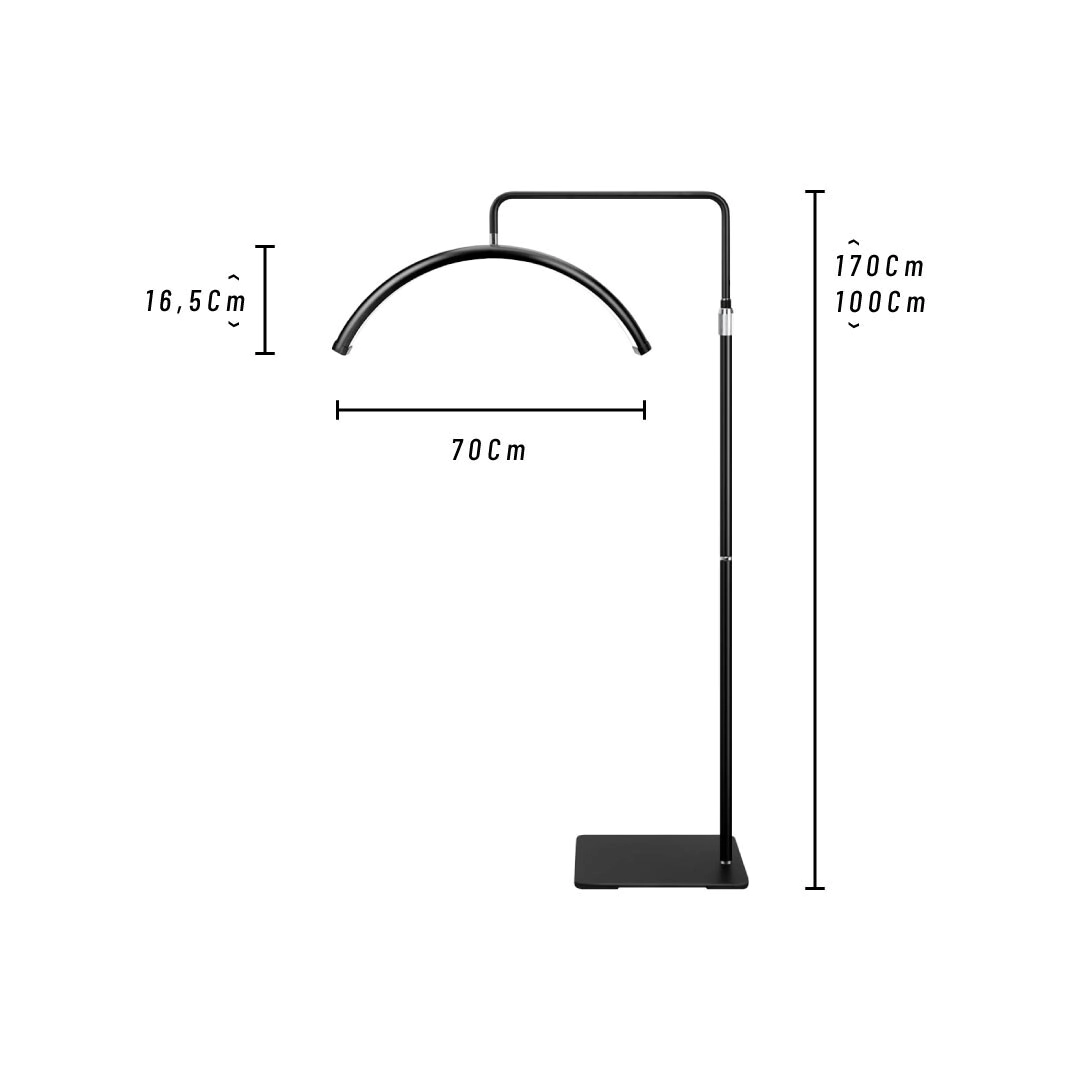 Diseño elegante y moderno. Tiene una estructura de metal, con una base estable que proporciona soporte. La parte superior presenta un arco curvado que alberga una luz LED, con un acabado que incluye una brillante. Incluye un mecanismo ajustable en la parte superior, lo que permite modificar la altura. Adecuada para uso en salones, oficinas o estudios, combinando funcionalidad y estética decorativa.