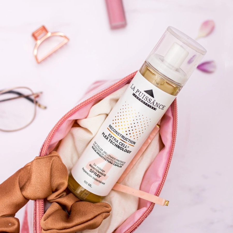Paso 4 Maintenance spray: es un spray perfumado que aporta ligereza y brillo, no se enjuaga, se puede aplicar tanto en cabello húmedo o en seco, y en cualquier momento del día para reforzar el tratamiento.