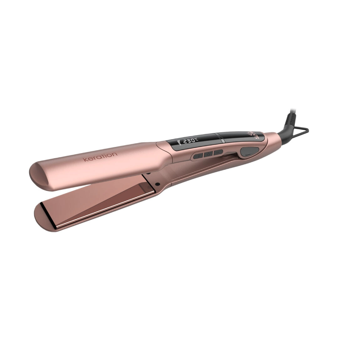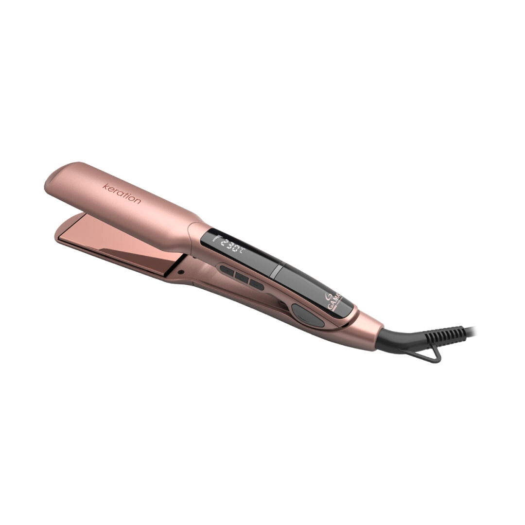 X-Wide Digital Keration presenta una evolución en las planchas tradicionales con placas anchas, que incluyen la tecnología más avanzada para asegurar peinados perfectos y el bienestar de tu cabello. Las placas miden 4 x 10 cm y permiten moldear incluso las melenas más largas de forma rápida y sencilla y, gracias a su revestimiento en turmalina, se deslizan fácilmente por tu cabello. Además, la turmalina emite iones negativos de forma natural cuando está caliente, eliminando el molesto problema del pelo electrizado y encrespado y dejándote un cabello sedoso y brillante. Sus placas amortiguadas permiten crear peinados profesionales con una sola pasada. Las placas se adhieren perfectamente al mechón que se peina, asegurando que todo el cabello reciba el mismo grado de calor. También puedes regular la temperatura de 20 C en 20 C desde 150 C hasta 230 C para que puedas elegir el nivel de calor más adecuado para tu tipo de cabello, que se mostrará en la pantalla de diseño. El sistema de bloqueo evitará que modifiques la temperatura de forma accidental durante su uso. Además, también cuenta con un cable giratorio de 360 para una mayor comodidad. Gracias a la tecnología Micro Glitt, esta plancha de pelo alisadora protege la keratina natural del cabello, reduciendo la pérdida de la misma.La KERATINA es parte de la estructura natural del cabello, se dice que el cabello es una fibra de keratina. La corteza (el 80% de la estructura capilar) está compuesta principalmente de este componente, como función principal es la encargada de aportarle resistencia al cabello y elasticidad. A partir de diferentes procesos químicos o mecánicos el cabello puede sufrir una pérdida de keratina y volverse más sensibilizado, visualmente opaco, poroso.