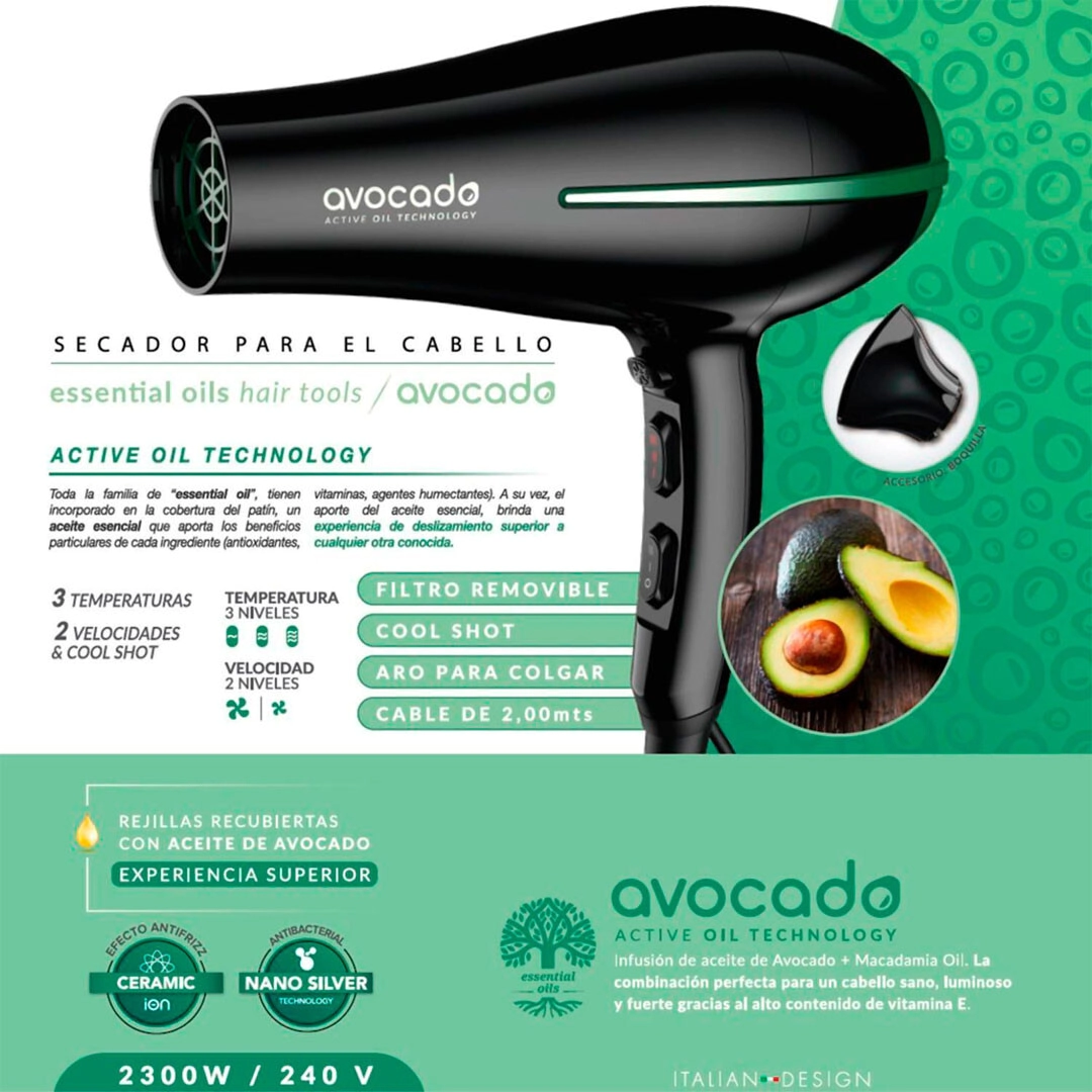 Secador que posee una infusión de aceite de Avocado, combinación perfecta para un cabello sano, luminoso y fuerte gracias al alto contenido de vitamina E.