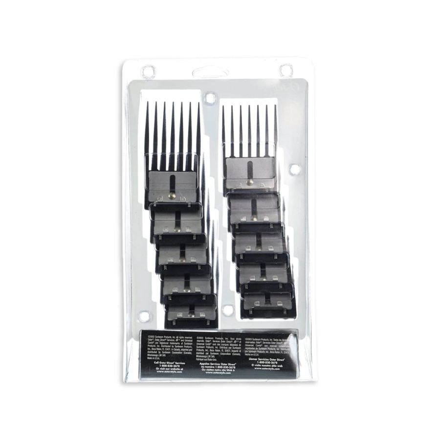 El producto Oster Universal Comb le permite cortar el cabello a una longitud específica y uniforme. Todos los tamaños de peines están diseñados para adaptarse a cualquier Oster Clipper, así como a la mayoría de los otros clippers disponibles. Y son fáciles de usar: simplemente coloque el peine en la base de la hoja, tire hacia arriba y asegúrelo en su posición. El producto Universal Comb forma parte de una línea completa de productos de aseo Oster de calidad.