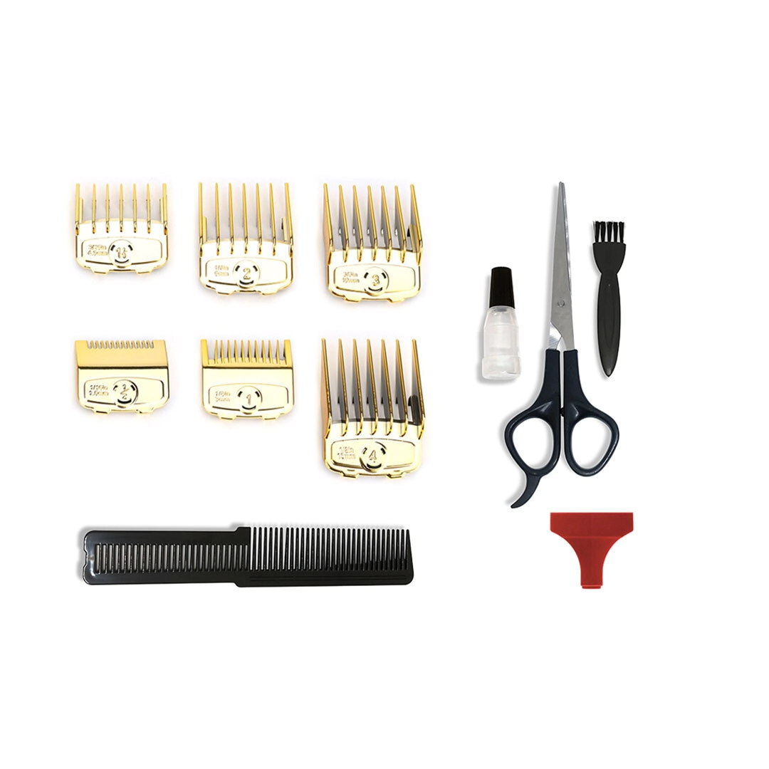 - Accesorios: Cortadora, 6 peines metálicos premium (1.5mm, 3mm, 4.5mm, 6mm, 10mm, 13mm), peine de borde plano, tijera, protector de cuchilla, aceite lubricante, cepillo de limpieza y llave de ajuste.