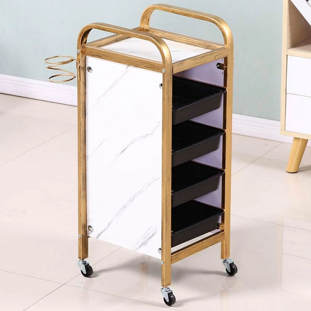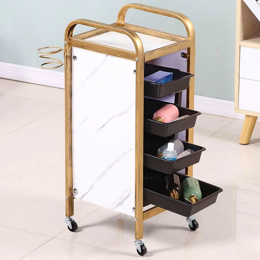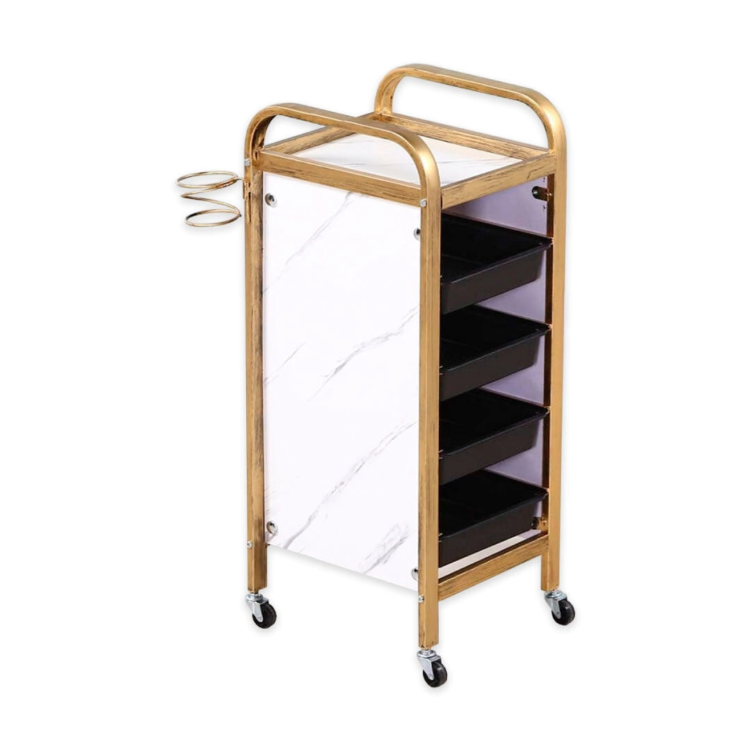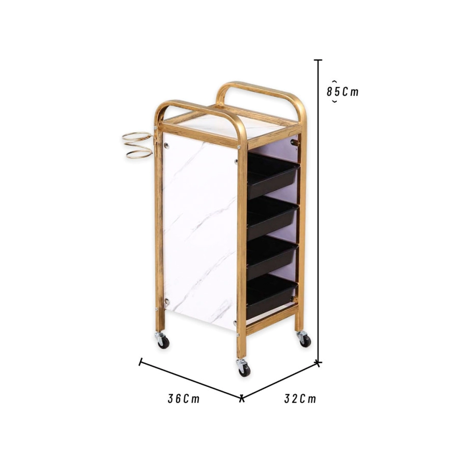 Este carrito de peluquería está fabricado en plástico ABS, ofreciendo durabilidad y un diseño moderno con acabado en elegante. Cuenta con niveles de bandejas, ideales para organizar herramientas y productos. Incluye un soporte para secador de pelo en la parte superior, junto con un asa para facilitar su movilidad. Además, está equipado con ruedas móviles que permiten desplazarlo con facilidad.