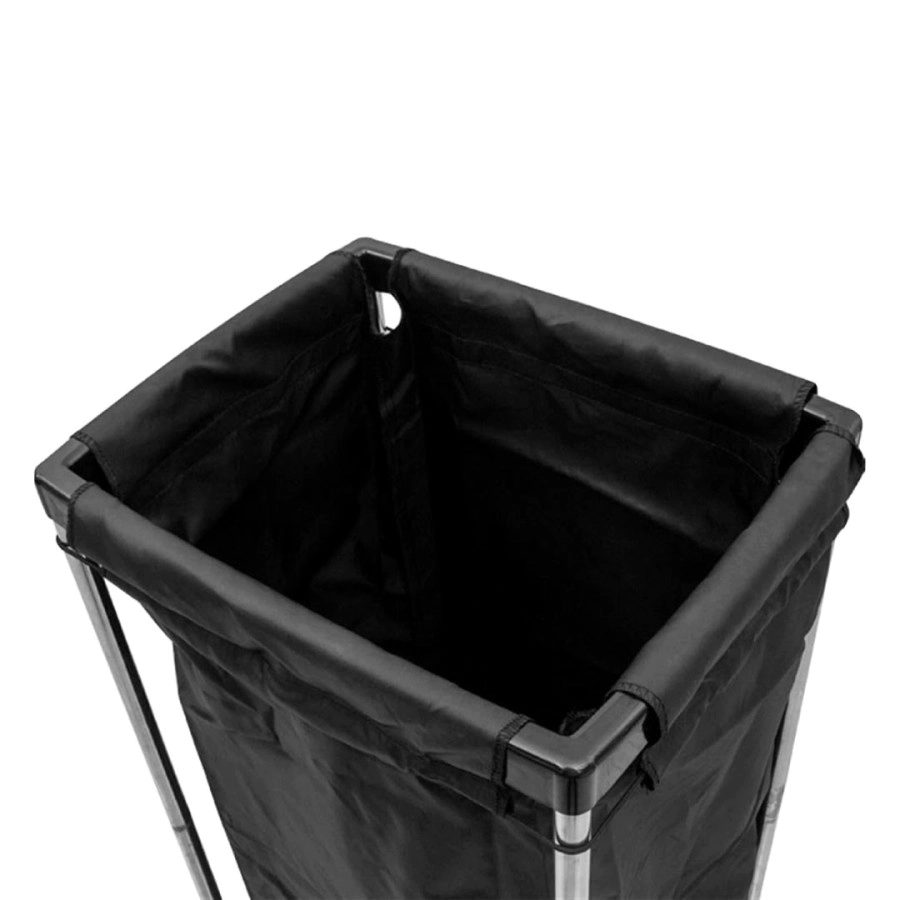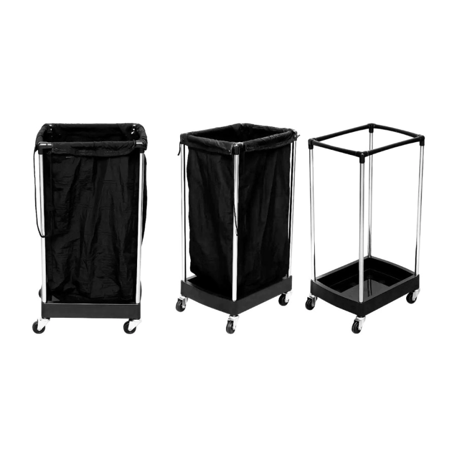 Carrito porta toallas de diseño funcional, con estructura de metal y base resistente. Incluye una bolsa de tela extraíble para almacenar toallas, sostenida por un marco tubular. Equipado con cuatro ruedas giratorias que facilitan su movilidad. Ideal para entornos como peluquerías, spas o salones de belleza.
