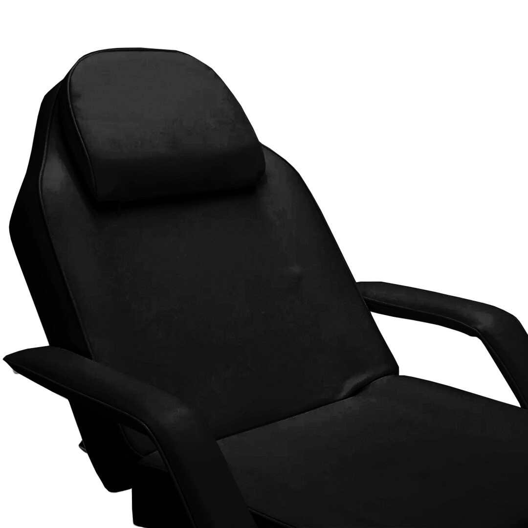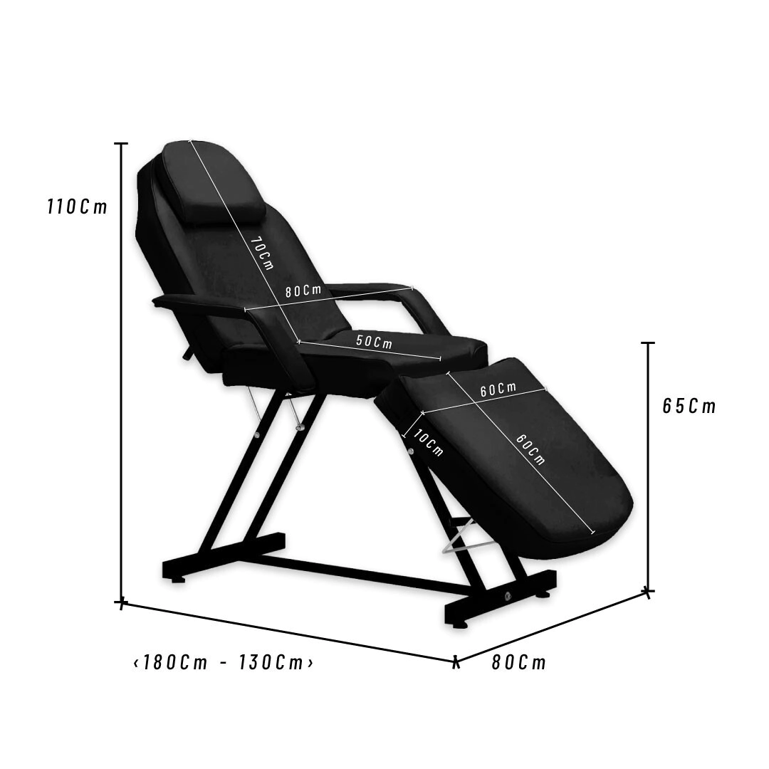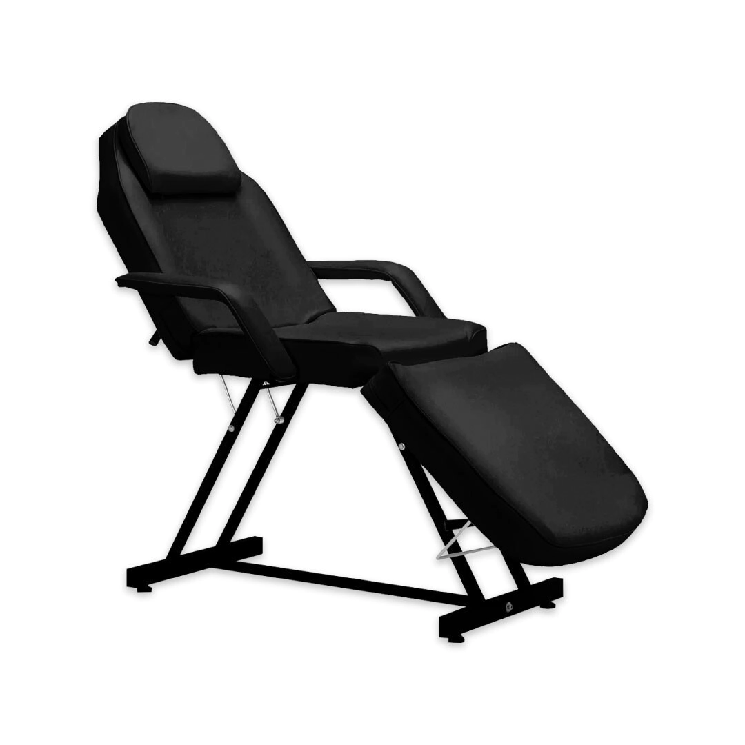 Camilla de salón multiusos. Esta unidad es excelente para hacerse un tatuaje, un masaje de cuerpo completo, un tratamiento facial y mucho más. Esta camilla está hecha de un marco de acero soldado resistente de alta calidad, respaldo reclinable y reposapiés. También viene con un cojín extraíble para la cabeza. Tiene un cómodo acolchado y piel sintética que seguramente puede durar años.