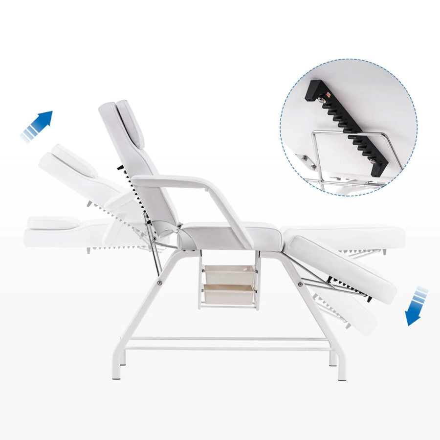 Fácil ajuste: el respaldo y el reposapiernas se pueden ajustar fácilmente de forma manual. La cama de belleza ajustable satisface las necesidades de los clientes en diferentes escenarios, como cuidado facial, masajes, tatuajes, SPA, depilación, etc.