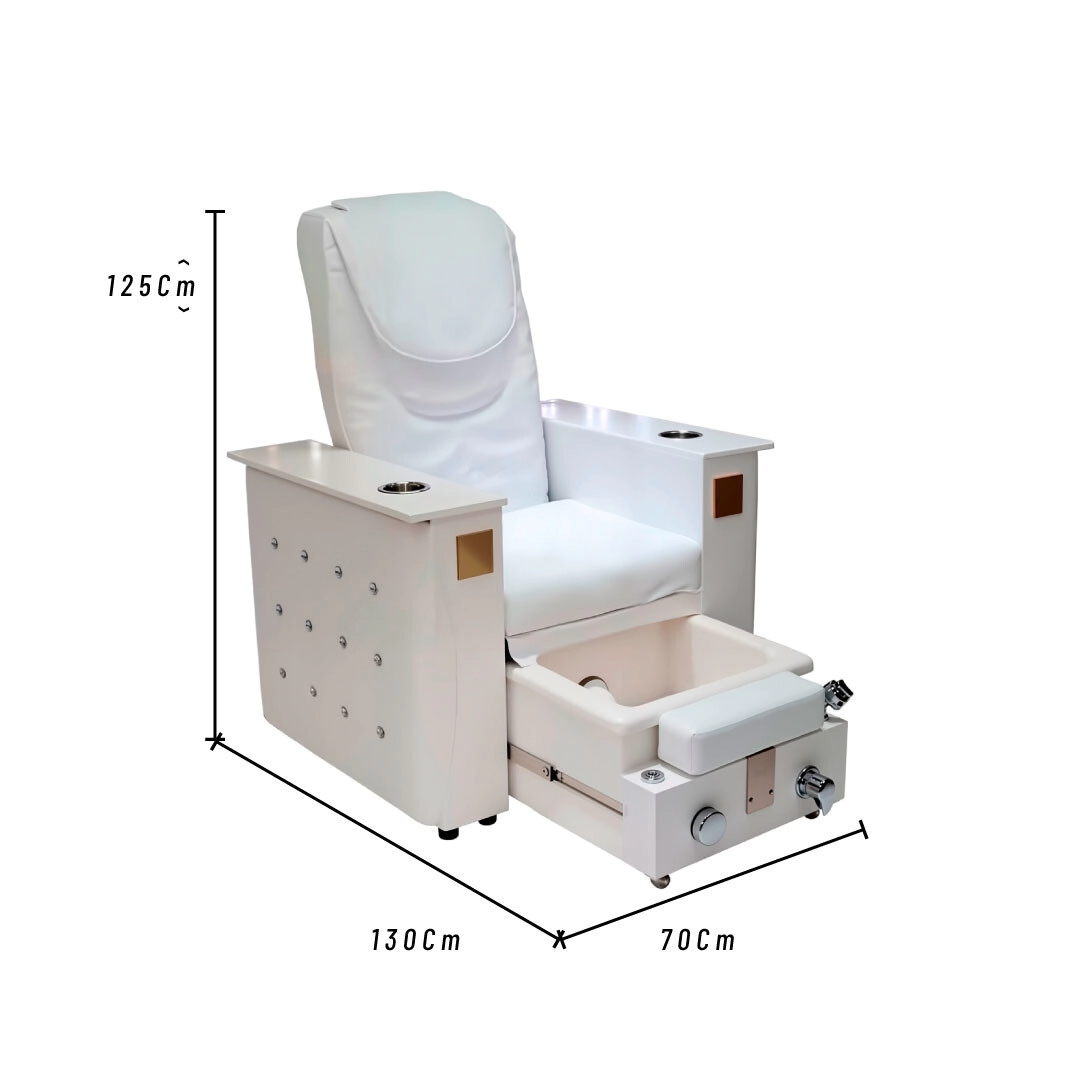 El sillón de pedicura combina elegancia y funcionalidad con un diseño moderno, fabricado con esponja de alta densidad para mayor comodidad. Incluye un respaldo reclinable automáticamente que se ajusta fácilmente a la postura deseada, acompañado de un sistema de masaje de espalda automático para una experiencia relajante. La base incorpora un spa para pies con un espacio de remojo y un reposapiés acolchado, ideal para tratamientos de pedicura.