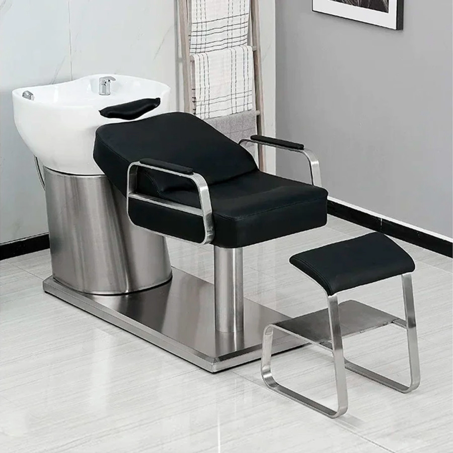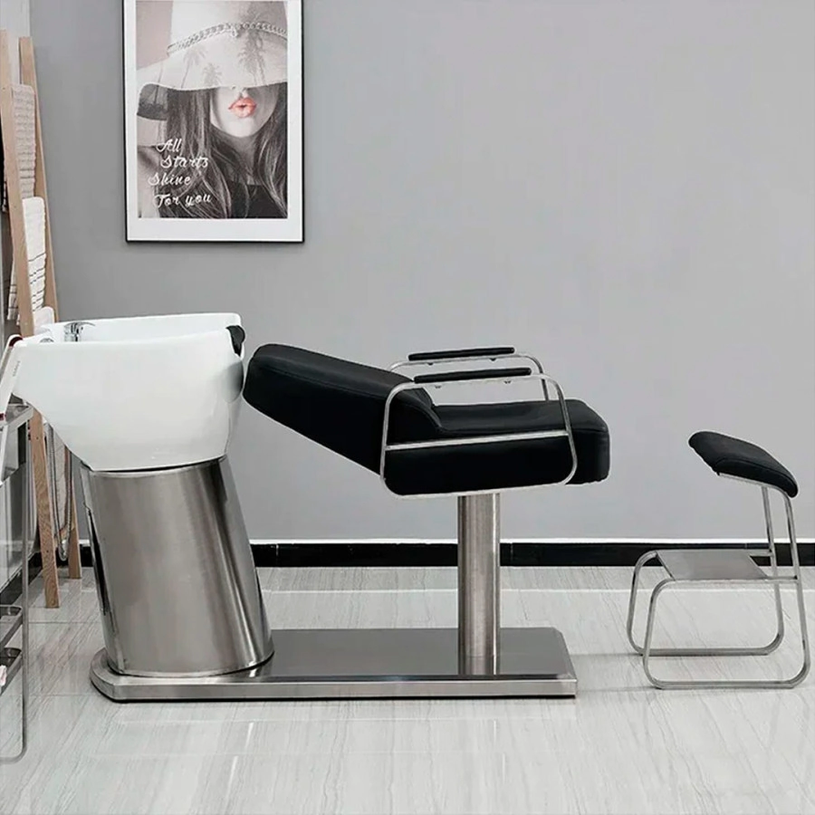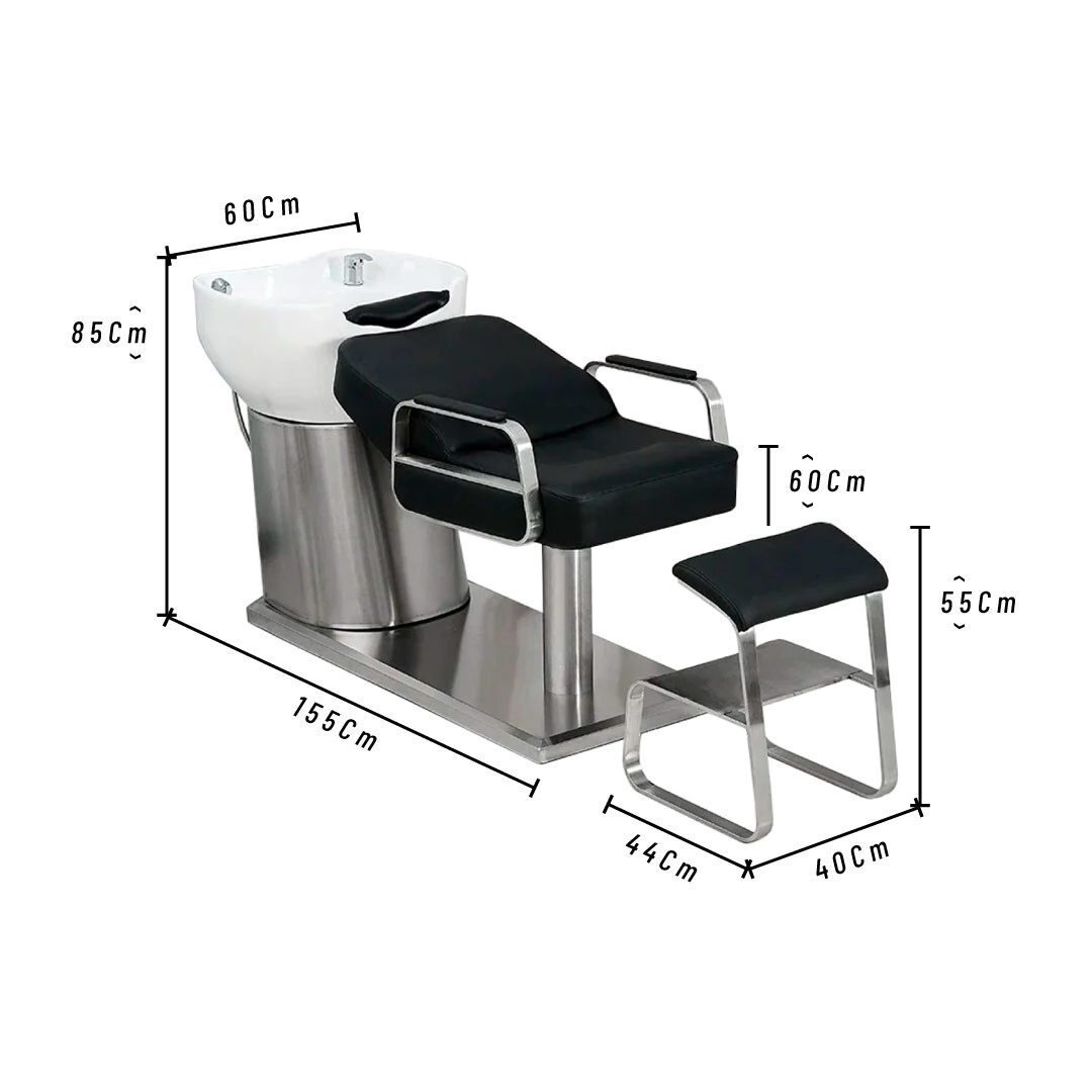 Lavacabezas de peluquería de diseño moderno y funcional, tapizado para mayor durabilidad y fácil limpieza. Cuenta con una esponja de alta densidad de 12 cm que garantiza máximo confort. Incluye una bacha de cerámica resistente y un monomando para un control preciso del agua. Los reposabrazos de acero inoxidable aportan elegancia y robustez, asegurando una experiencia premium para el cliente.