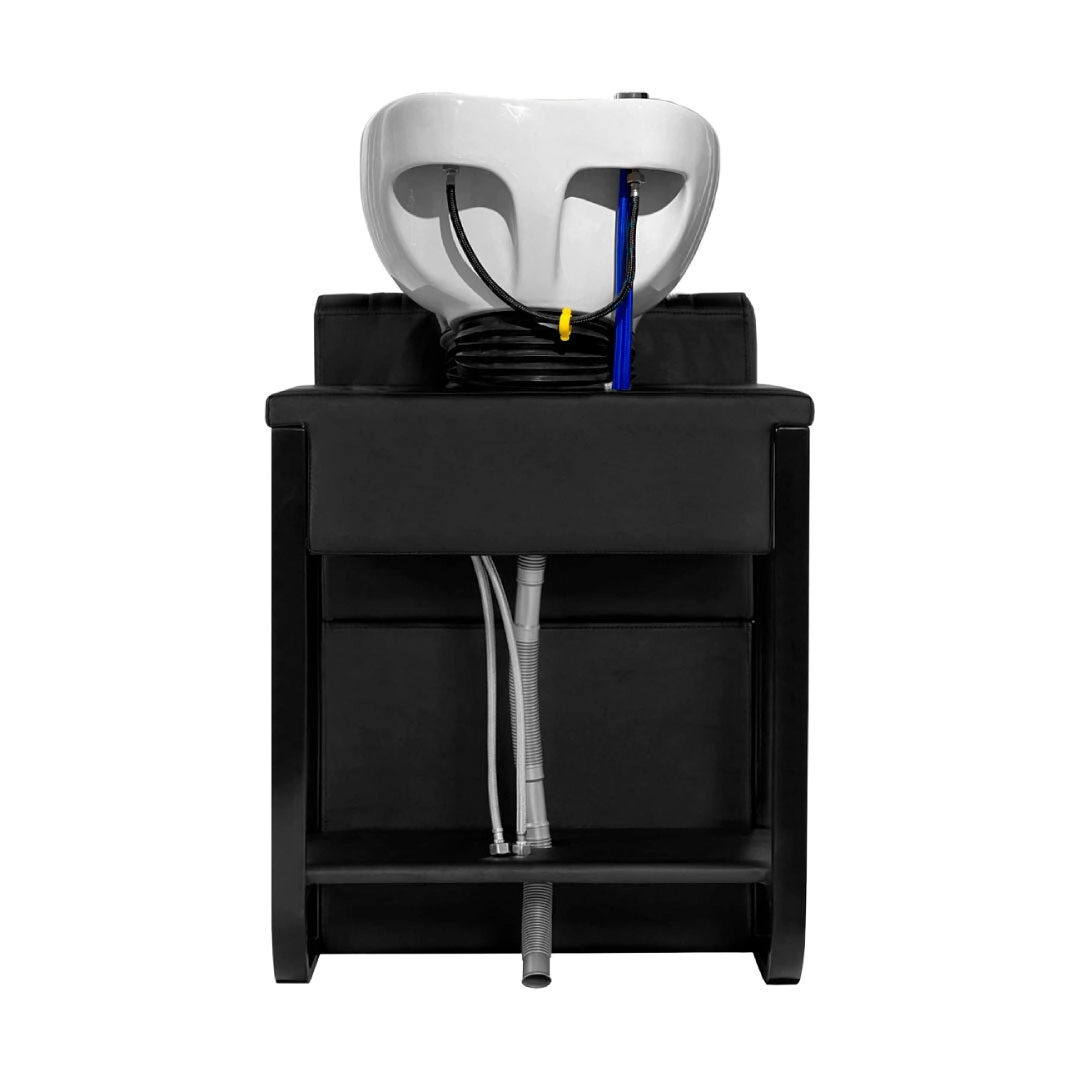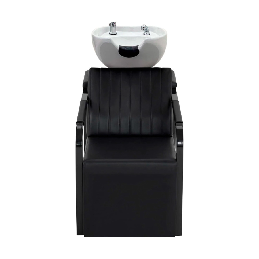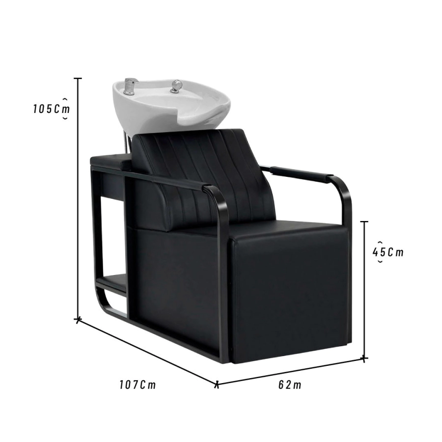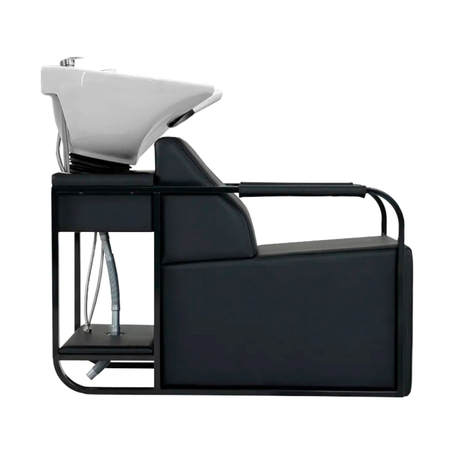 Diseño contemporáneo y funcional, ideal para salones de belleza. La bacha, fabricada en cerámica negra brillante, tiene una forma ergonómica con un contorno que se adapta al cuello para mayor comodidad. Incluye grifos para un fácil control del agua. El sillón, tapizado en cuero sintético negro con costuras verticales, cuenta con reposabrazos metálicos curvados, ofreciendo soporte acolchado. La estructura incluye una base metálica con un estante inferior, proporcionando almacenamiento adicional y estabilidad.