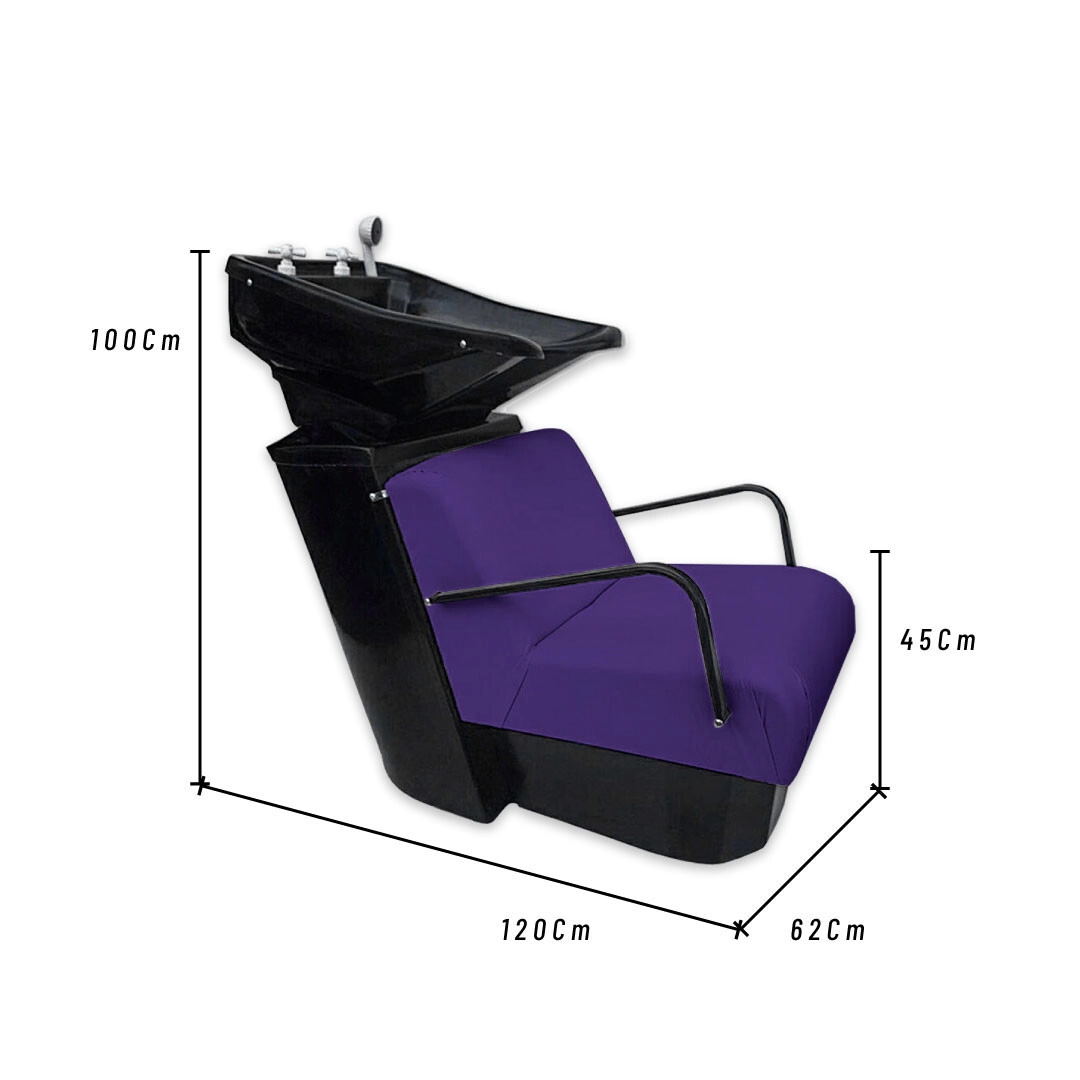 La bacha es basculante, cuenta con dos perillas y un duchador con flexible. La base y bacha son de plástico y el sillón tiene poliester tapizado en cuerina.