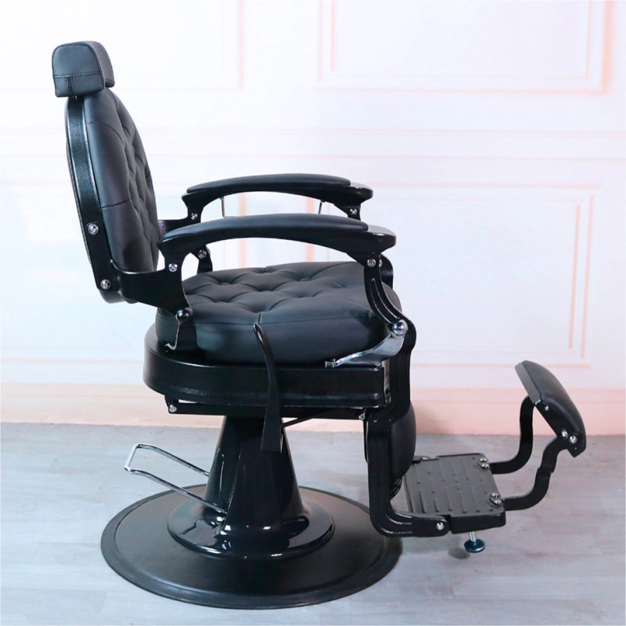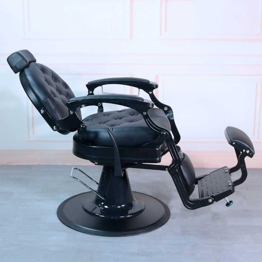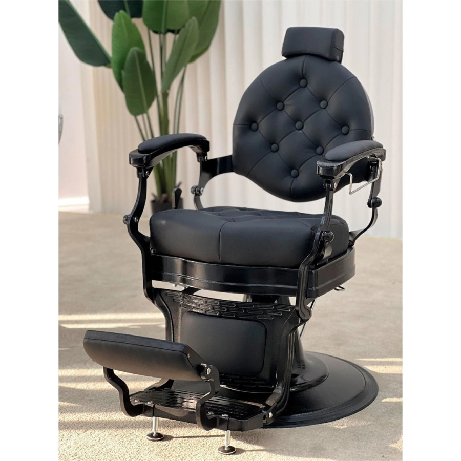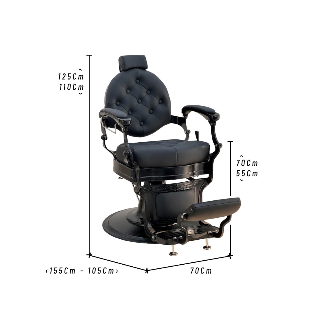 Diseño de estilo clásico y robusto, ideal para tu barbería o peluquería vintage. Está fabricado con una estructura de metal negro que le otorga estabilidad y durabilidad, combinada con un acabado en cuero negro acolchado que cubre el respaldo, el asiento, los apoyabrazos y el reposapiés. El respaldo presenta un patrón de botones capitoné que añade un toque elegante y tradicional. Los apoyabrazos son anchos y ergonómicos, con extremos acolchados para mayor comodidad. El sillón cuenta con un reposapiés ajustable y un mecanismo que permite reclinar el respaldo, ofreciendo una experiencia personalizable. La base circular y giratoria facilita el movimiento. Este diseño combina funcionalidad con un estilo nostálgico, perfecto para profesionales que buscan un mueble distintivo y práctico.