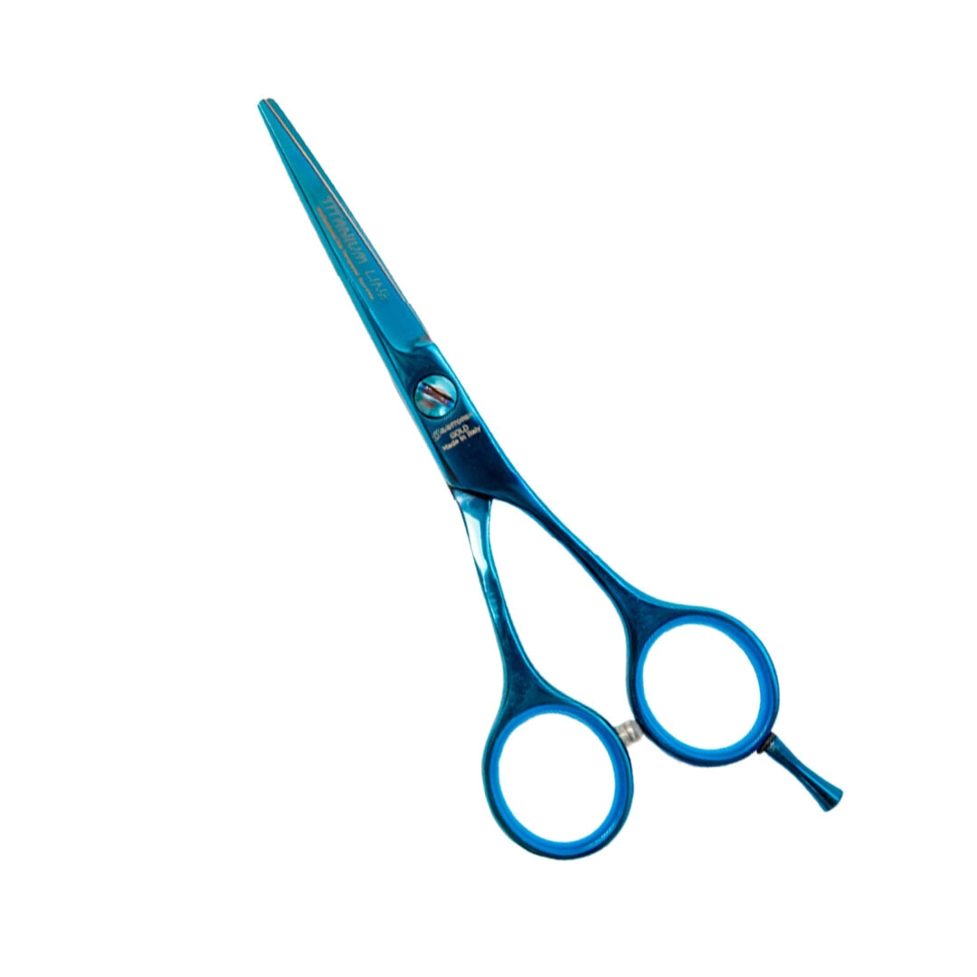 Destaca por su acabado en un vibrante color azul metálico. Diseñada con cuchillas rectas y afiladas, es ideal para cortes precisos en peluquería. Los mangos ergonómicos, con anillos de color azul claro, ofrecen un agarre cómodo y seguro. Su diseño moderno y resistente la hace perfecta para uso profesional.
