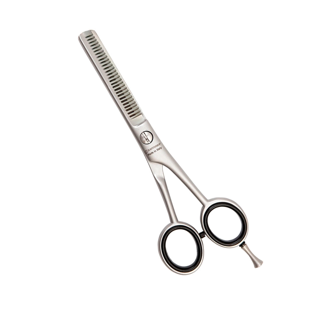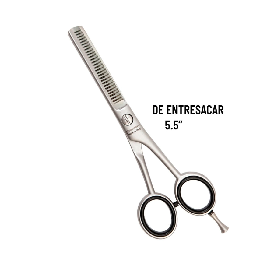 Con una hoja dentada que remueve aproximadamente el 50% del cabello en cada corte, ideal para texturizar y reducir volumen sin alterar el estilo general. Su diseño ergonómico incluye mangos cómodos con anillos ajustables para un agarre seguro y preciso, y un acabado metálico satinado que garantiza durabilidad y facilidad de mantenimiento. Perfecta para peluqueros profesionales que buscan calidad italiana en cortes finos y detallados.