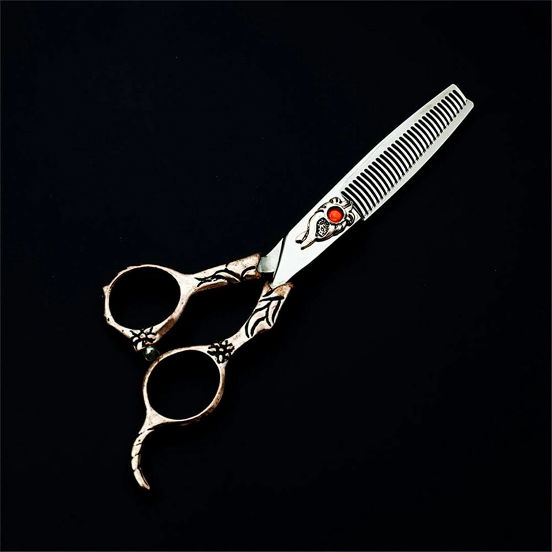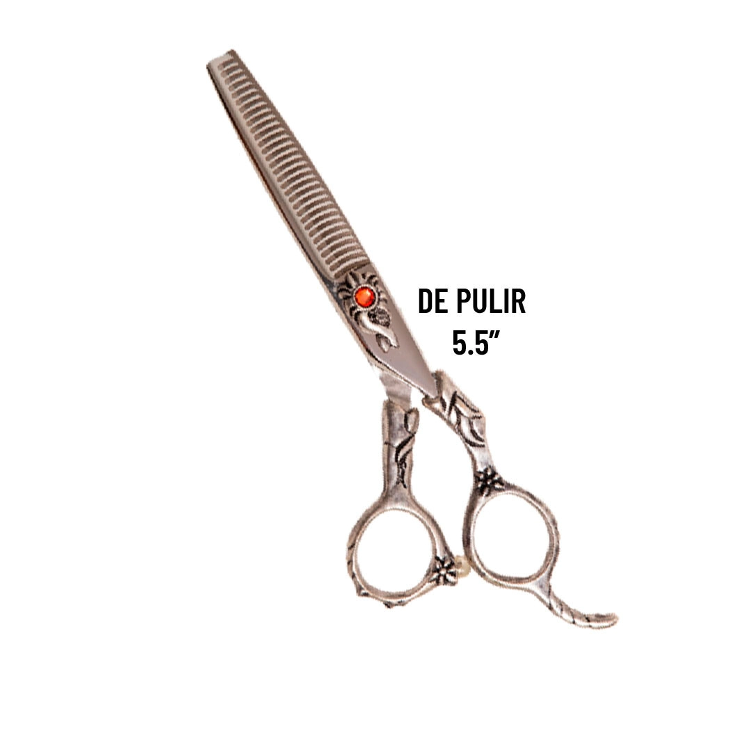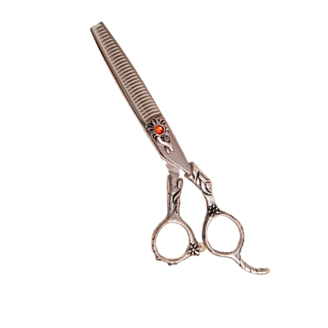 Presenta un diseño elegante y sofisticado con un acabado metálico brillante. Cuenta con mangos ornamentados con detalles florales grabados, lo que le otorga un toque artístico. Incluye una gema roja incrustada cerca de la unión, añadiendo un detalle distintivo. ideal para un corte preciso, mientras que los anillos de los mangos están diseñados ergonómicamente para un agarre cómodo. Perfecta para uso profesional o como pieza decorativa.