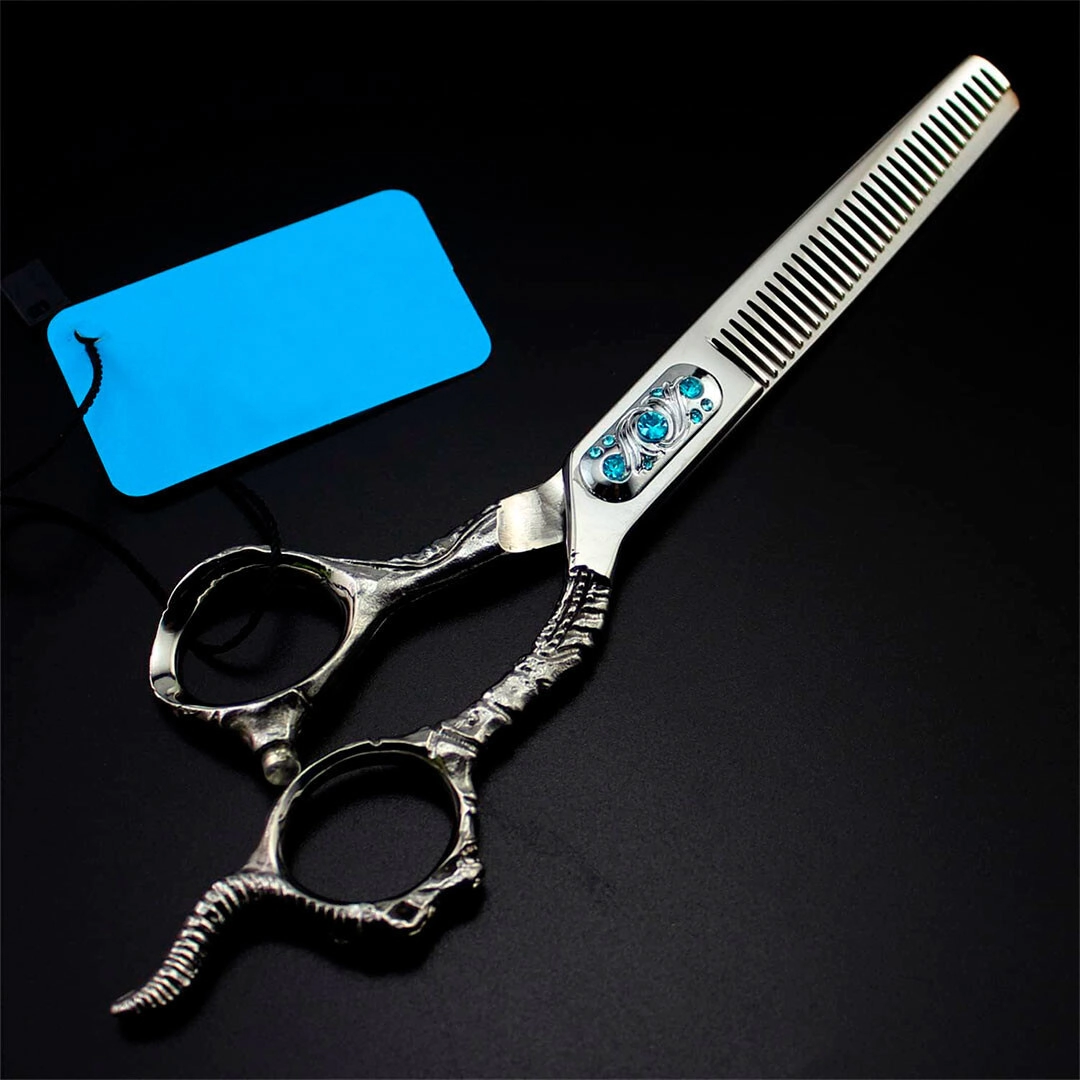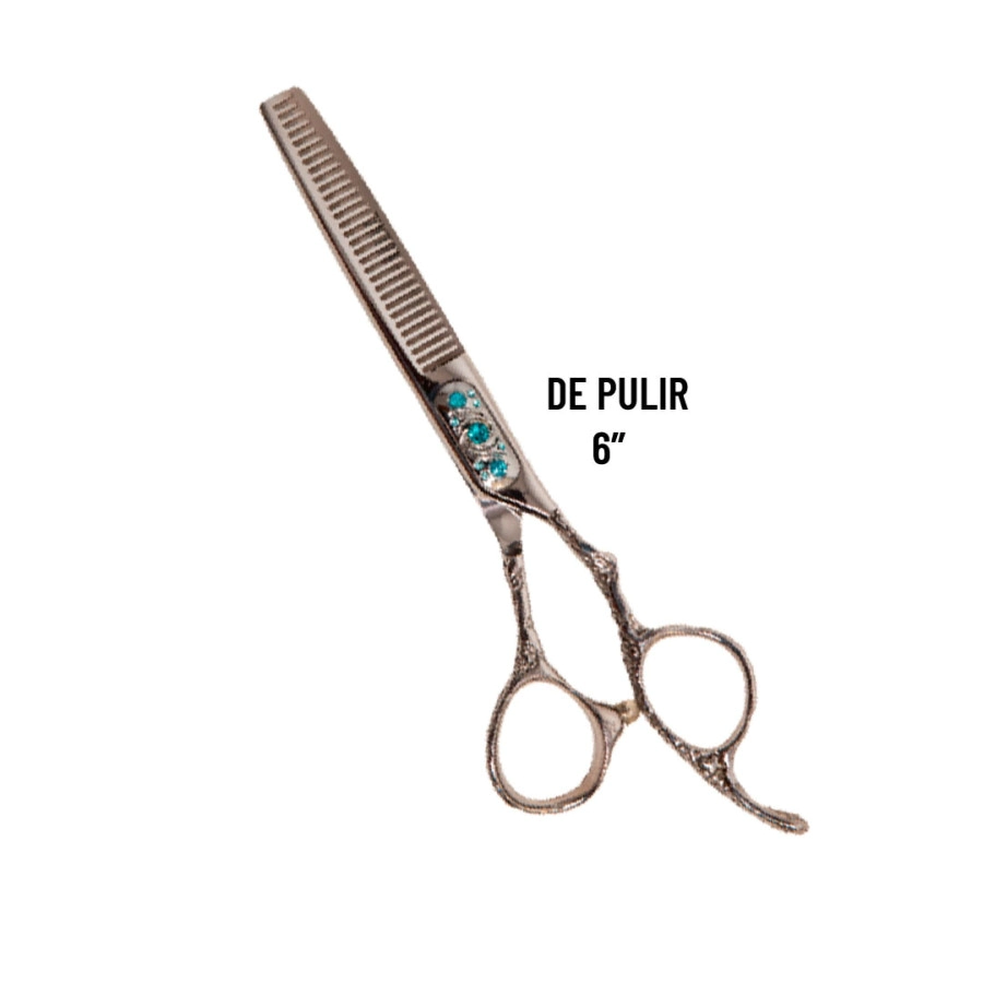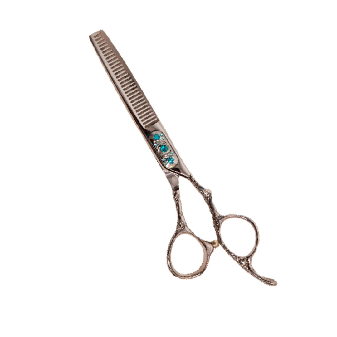 Diseño sofisticado, perfecta para uso profesional en peluquería. Su acabado metálico brillante se complementa con mangos ornamentados con detalles florales grabados y tres gemas turquesas incrustadas cerca de la unión, añadiendo un toque elegante. Los anillos de los mangos están diseñados ergonómicamente para un agarre cómodo y preciso.