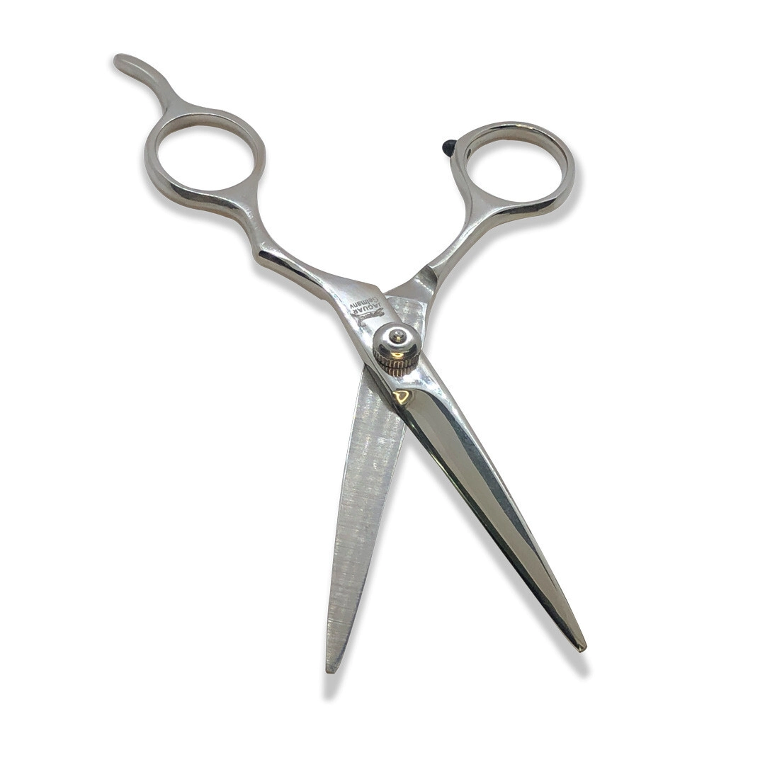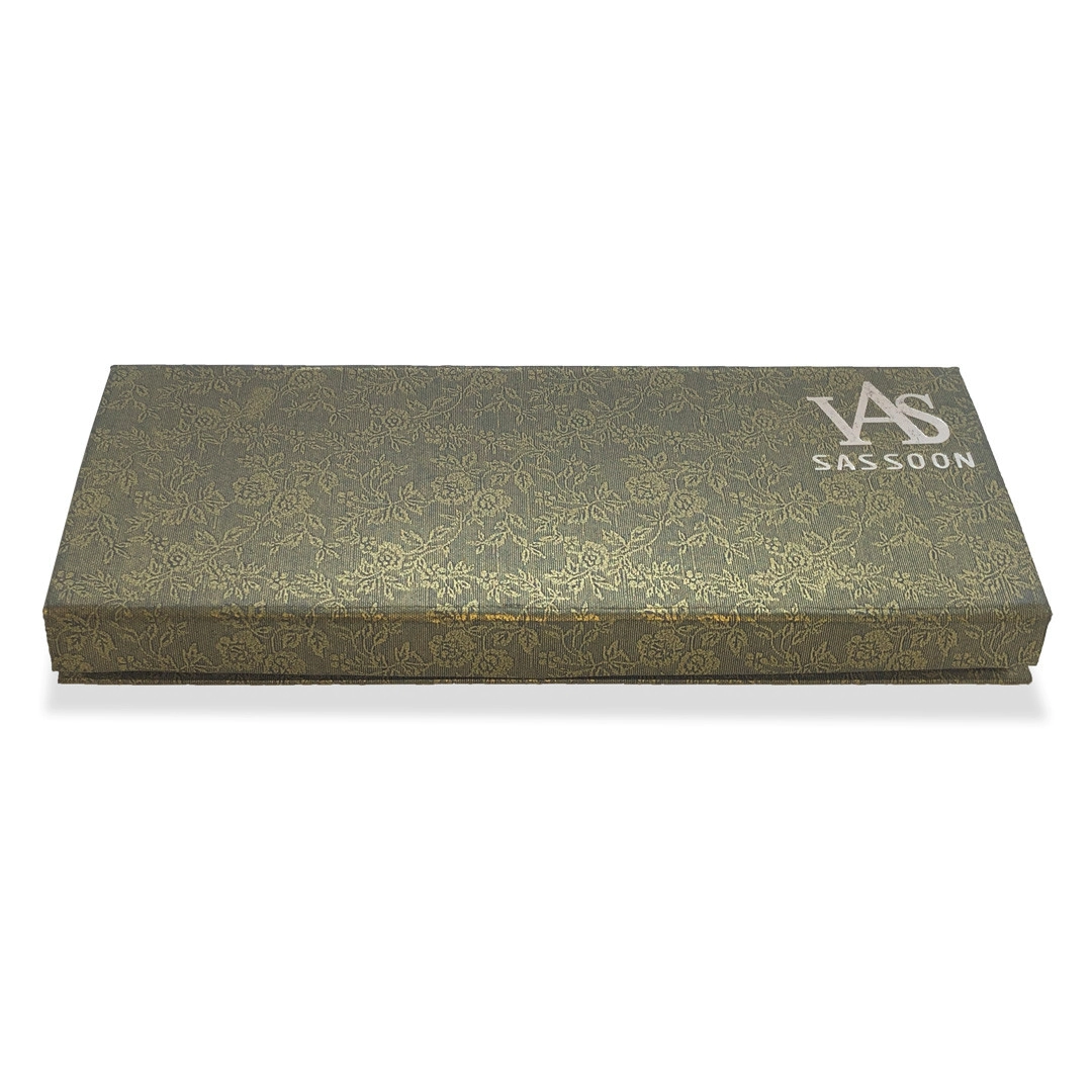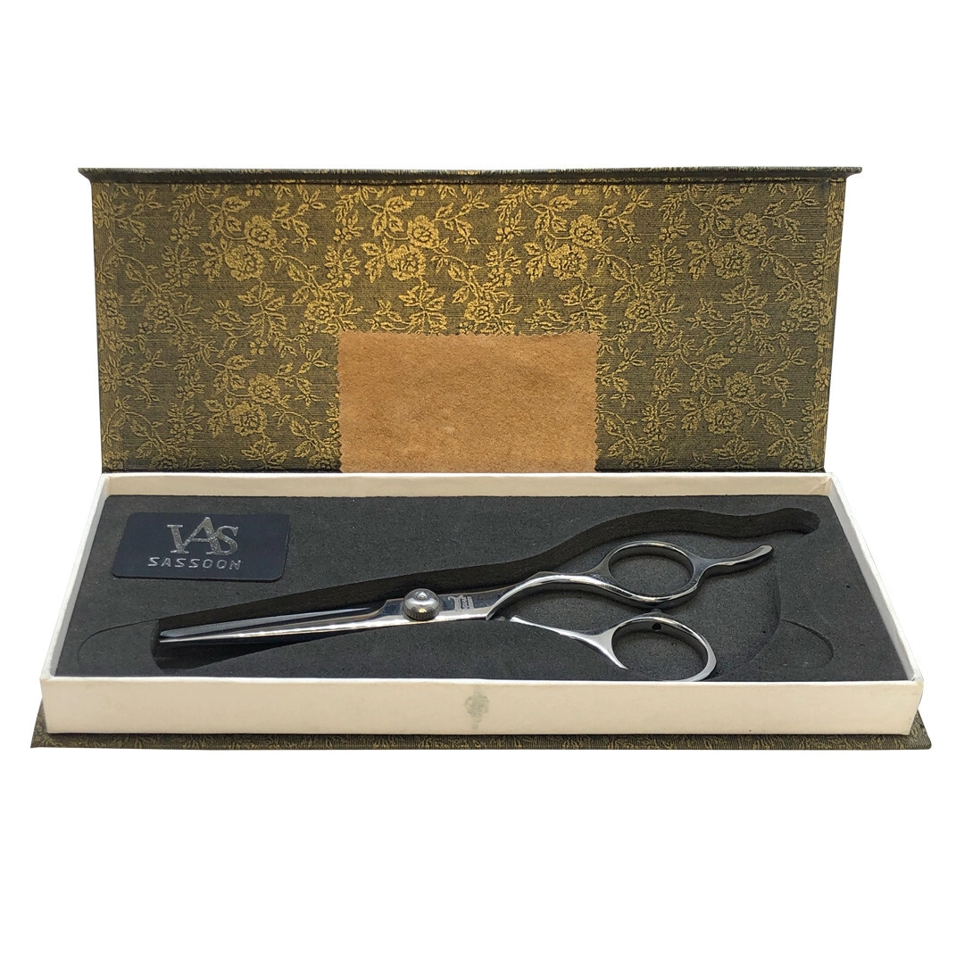 Recortar, esculpir y cortar es más fácil con la tijera filo de navaja Vass Sasson. Cuenta con un acabado pulido brillante, un silenciador para el apoyo del dedo meñique y anillos de plástico que se pueden retirar.